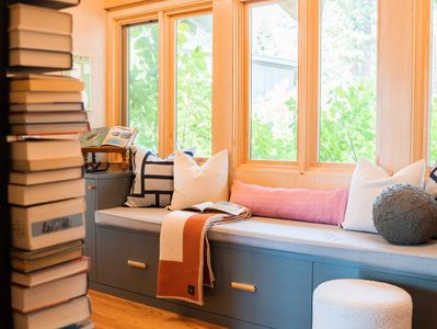 “In this project, we prioritized a cozy reading environment over floor-to-ceiling shelving by designing a built-in window seat with integrated storage for books and dress-up clothing. A sleek tower bookshelf provides easy access to favorite titles, creating a space that is both functional and inviting— also Clover approved!”